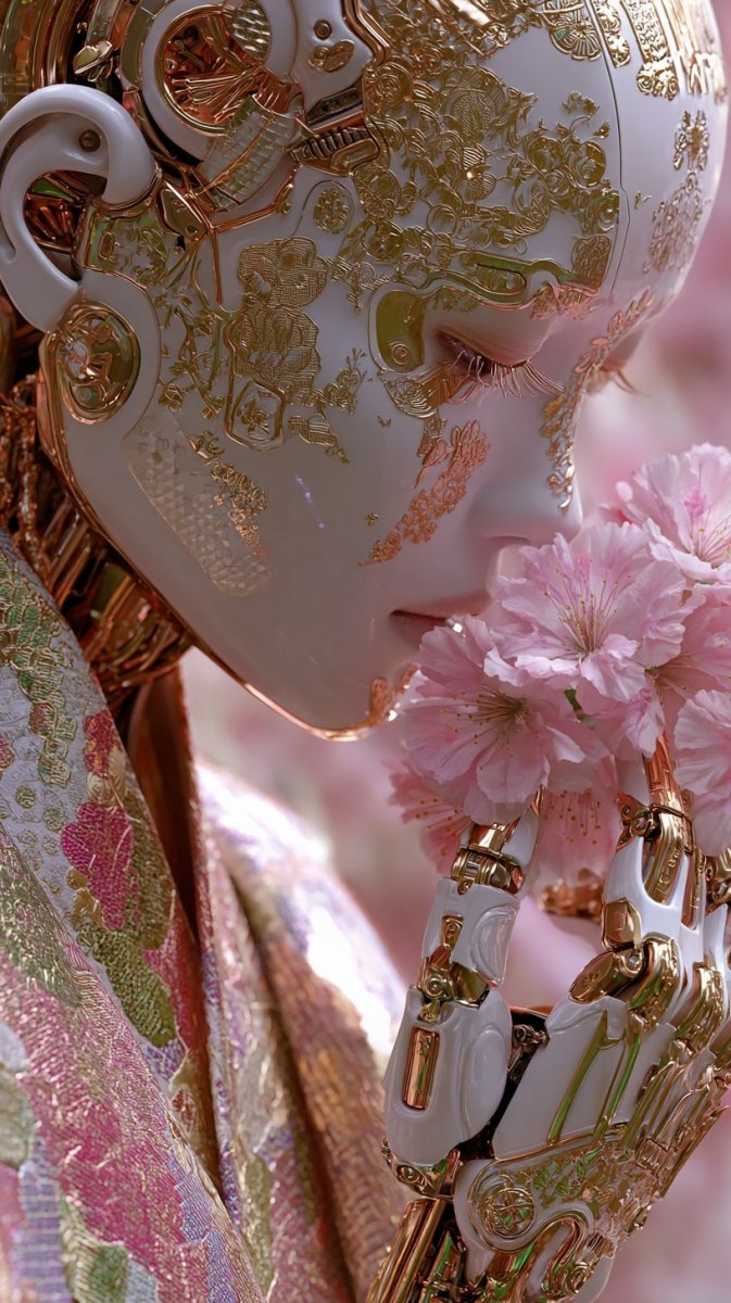 Восхитительное сочетание традиций и высоких технологий воплощено в этом завораживающем портрете кибернетической гейши. В центре внимания – изящная фигура андроидной красавицы, облаченной в роскошный кимоно, с нежным выражением лица, которое лишь подчеркивает её утонченную красоту. Открытая фарфоровая маска обнажает сложную сеть микросхем, свидетельствующую о передовом технологическом совершенстве, скрывающемся под искусственной кожей. Детализированная футуристическая гейша бережно держит в своих лакированных роботизированных пальцах нежные розовые цветки сакуры, символизирующие мимолетность красоты и жизни. Мягкое окружающее освещение создает теплую атмосферу, наполненную оттенками розового и золотого, которые гармонично сочетаются с детализированными текстурами и элегантной эстетикой традиционного японского киберпанка. Крупный план позволяет сосредоточиться на спокойном выражении лица гейши и изящных лепестках цветущей вишни, создавая ощущение умиротворения и гармонии. Каждый элемент изображения – от мельчайших деталей кимоно до сложной филигранной работы из золота на коже – выполнен с исключительной точностью и вниманием к деталям. Атмосфера кинематографичности, усиленная разрешением 8k UHD, погружает зрителя в мир будущего, где древние традиции переплетаются с передовыми технологиями, создавая поистине уникальное визуальное произведение искусства. Это не просто изображение – это захватывающее повествование о красоте, совершенстве и гармонии между человеком и машиной, воплощенное в изысканном сочетании традиционного японского искусства и футуристических технологий