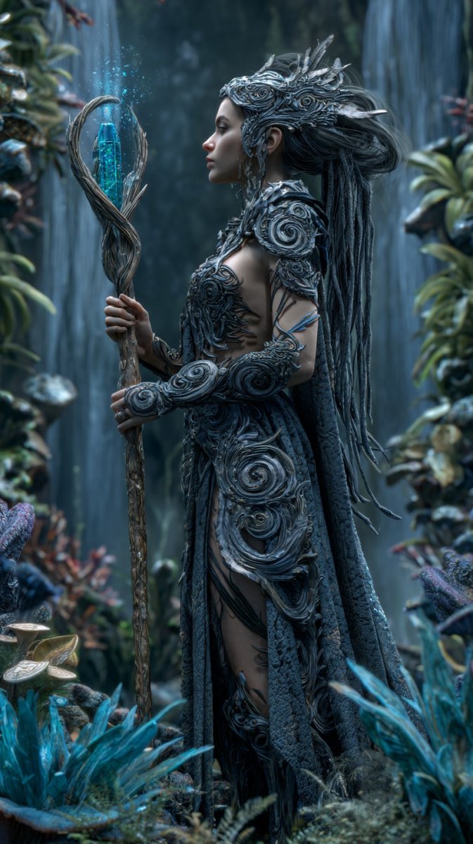 hd, volumetric, hyperrealistic female figure, wearing intricate obsidian armor adorned with swirling silver patterns, wielding ornate crystal staff emitting ethereal blue light, atmospheric scene with cascading waterfalls and floating bioluminescent flowers, vibrant flora at feet, dramatic moody lighting emphasizing texture and depth, dark fantasy magical vibe, cinematic composition, uhd, photorealistic, rich colors, long raven hair, realistic metal reflection and fabric movement, style photorealistic, BG is mystical enchanted forest.