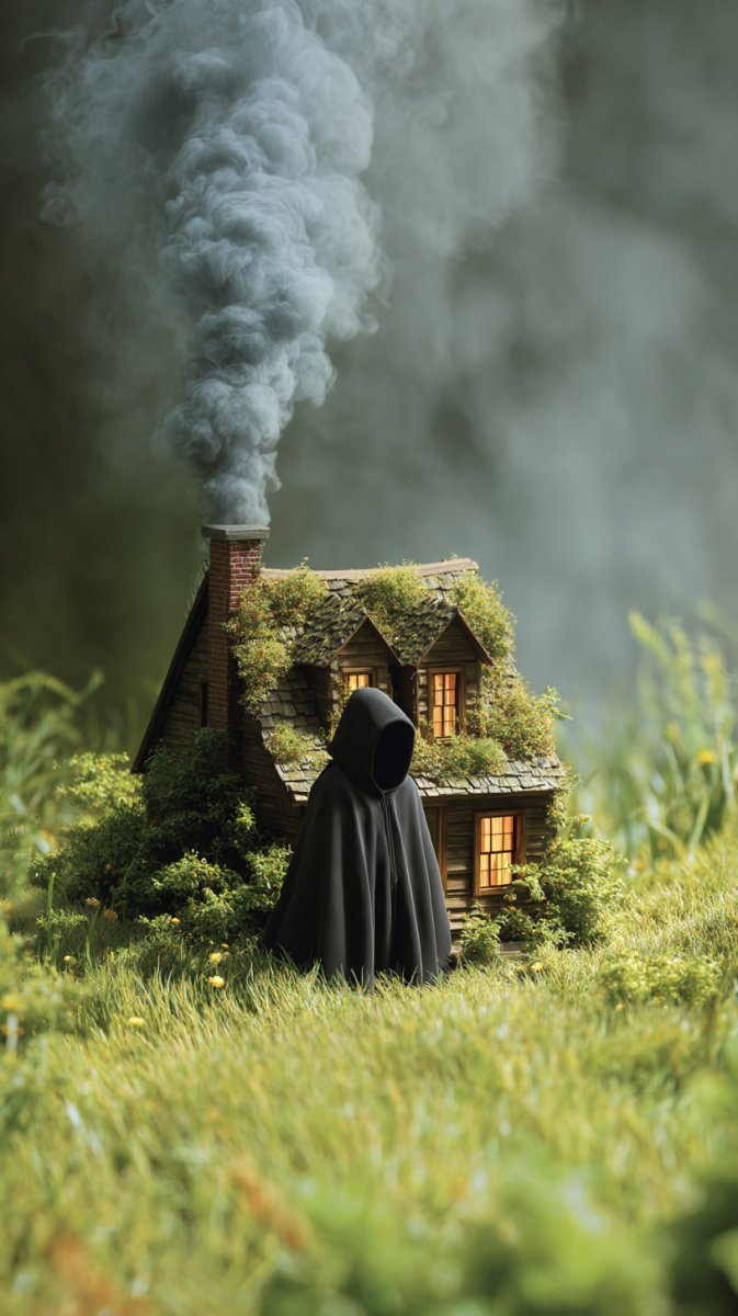 cozy miniature cottage wrapped in a black hood, chimney smoke gently rising, detailed blades of grass, rich colors, photorealistic style.