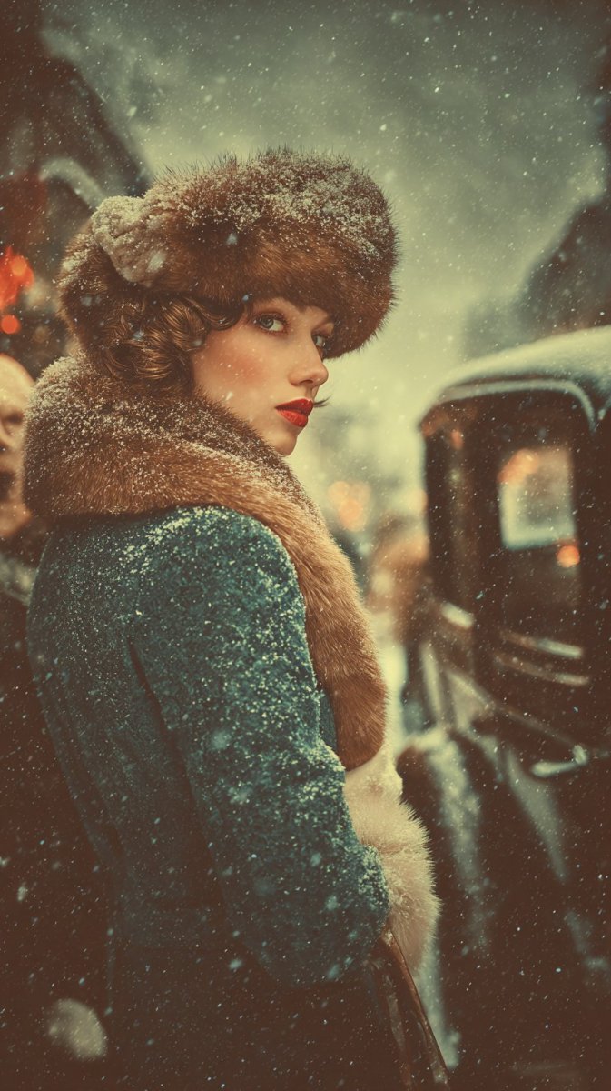 Очаровательная женщина в роскошном меховом пальто и элегантной шляпе запечатлена на фоне заснеженной улицы, создавая атмосферу ностальгии по золотой эпохе. Ретро автомобиль, словно сошедший со старинной открытки, дополняет эту волшебную картину. Привлекательные губы и стильный наряд подчеркивают безупречный вкус героини, а падающие снежинки добавляют романтики в этот зимний вечер. Лицо модели поражает своей детализацией, передавая всю глубину чувств и эмоций. Задний план погружает зрителя в атмосферу винтажного города 1940-х годов, где царит неповторимая эстетика ретро и романтики. Эта фотография – настоящее произведение искусства, переносящее нас во времени в эпоху элегантности и шарма, когда каждая деталь имела значение, а стиль был неотъемлемой частью жизни. Застывший момент, полный красоты и утонченности, дарит ощущение тепла и комфорта даже в самый холодный зимний день. Это история о любви, красоте и вечной привлекательности женственности, рассказанная языком ретро-стиля и волшебной атмосферы прошедшей эпохи. Кажется, что время остановилось, чтобы запечатлеть этот незабываемый образ на долгие годы