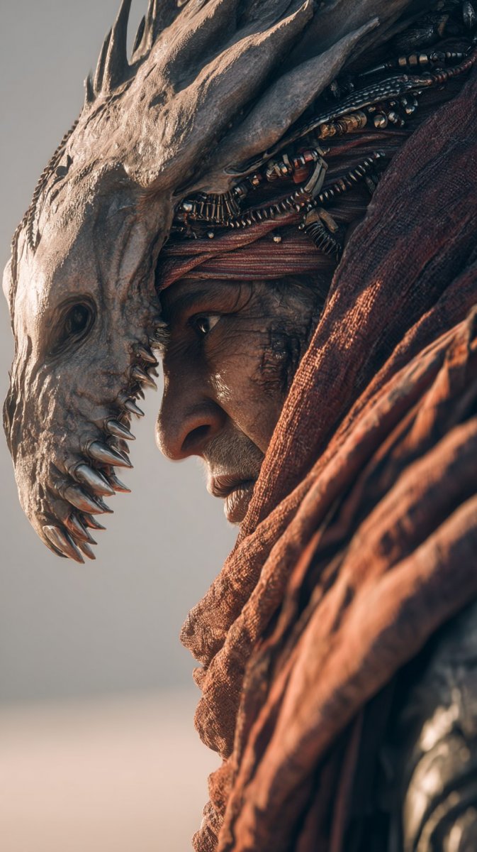 desert nomad riding colossal sandworm through crimson dunes, weathered face etched with wisdom and resilience, flowing robes billowing in wind, ornate tribal jewelry shimmering in sunlight, uhd, hyperrealistic textures, cinematic atmosphere, vibrant reds and oranges, dynamic perspective, 8k uhd, camera: red cinema x9, lens: anamorphic 1.4x.