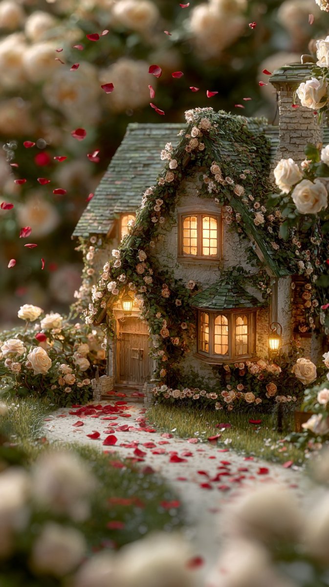 breathtaking miniature cottage wrapped in cream roses, detailed blades of grass, swirling mist and floating red rose petals, luminous yellow colors, photorealistic style, camera: canon eos r5.