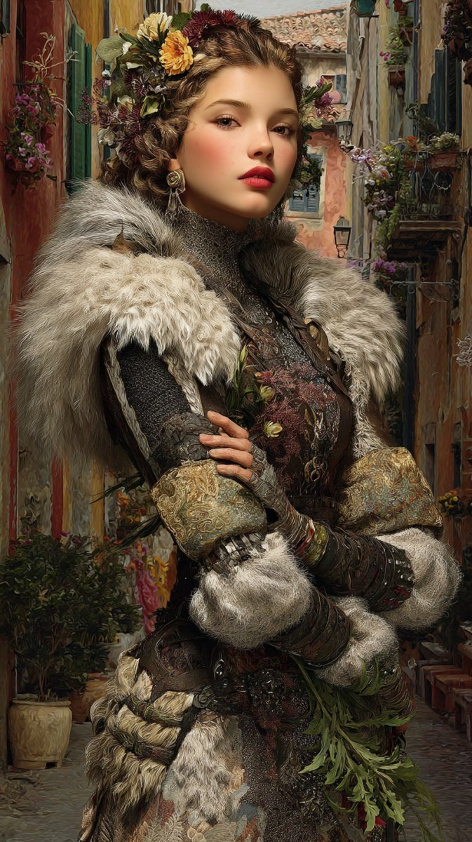 Завораживающий портрет загадочной женщины в объемном формате, облаченной в массивный кожаный доспех из шкур и меха. Ее привлекательные губы контрастируют с замерзшими цветами, создавая ощущение хрупкости и силы одновременно. Атмосфера ретро-винтажного романтизма 1940-х годов переносит зрителя на оживленную улицу, наполненную богатыми красками и деталями. Изображение излучает ауру таинственности и притягательности, сочетая в себе элементы дикой природы и изысканной элегантности. Женщина словно сошла со страниц старинной фотографии, запечатленной во времени и пространстве. Ее взгляд полон глубокого смысла, а образ в целом вызывает ощущение ностальгии по ушедшей эпохе и восхищение мастерством исполнения. Каждый элемент композиции тщательно проработан, создавая гармоничный ансамбль из текстур, цветов и форм. Это не просто портрет – это целая история, рассказанная без слов, повествующая о красоте, стойкости и загадочности женского облика в контексте определенной исторической эпохи. Кажется, что она только что вышла из старинного кинотеатра или готовится к важной встрече на фоне ретро-пейзажа