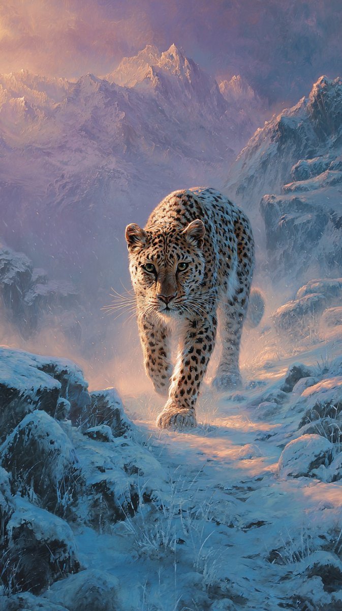 Величественный снежный барс, скользящий по лунным склонам горного хребта, воплощает собой дикую красоту и непредсказуемость природы. Заснеженные вершины служат фоном этой завораживающей сцене, а клубящийся туман вокруг лап животного добавляет загадочности и мистической глубины изображению. Стиль, выполненный в импрессионистской манере, передает ощущение мимолетности момента, акцентируя внимание на игре света и тени, текстуре снега и шерсти хищника. Неожиданным дополнением к этому пейзажу служит мерцающее северное сияние, парящее над головой барса – волшебный калейдоскоп красок, создающий атмосферу нереальности и сказочной красоты. Это произведение искусства запечатлевает момент единения между мощью дикого зверя и великолепием космического явления, передавая ощущение благоговения перед силой природы и ее способностью удивлять и восхищать. Картина словно шепчет о тайнах горного мира и о скрытой гармонии между земным и небесным, приглашая зрителя окунуться в мир фантазий и ощутить себя частью этой величественной сцены