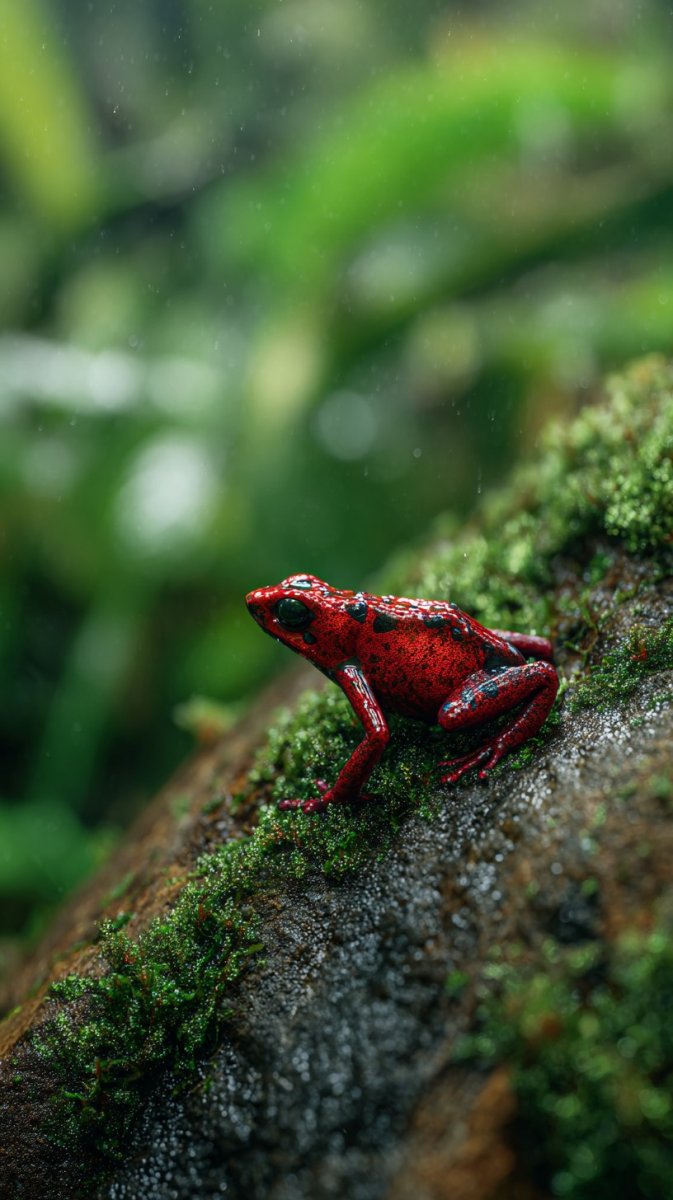Яркая алая древесная лягушка-листолаз восседает на мшистом камне в самом сердце пышного тропического леса. Эта удивительная сцена запечатлевает момент, когда лягушка ловко ловит каплю дождя своим длинным языком демонстрируя невероятную точность и скорость. Изображение выполнено в гиперреалистичном стиле с поразительной детализацией, позволяющей рассмотреть каждую чешуйку на коже лягушки и текстуру мха. Вокруг нее танцует замысловатая сеть светящихся светлячков, создавая волшебную атмосферу и подчеркивая красоту этого уникального уголка природы. Композиция полна жизни и движения, а яркие цвета добавляют динамичности и драматизма. Это не просто изображение – это окно в невероятный мир тропических лесов, где каждый элемент наполнен чудесами и тайнами. Наблюдая за этой сценой, ощущаешь себя непосредственным участником происходящего, словно находишься рядом с этим крошечным созданием, живущим своей насыщенной жизнью в окружении буйной растительности и мерцающих огней. Безупречная реализация позволяет зрителю полностью погрузиться в атмосферу тропического рая и восхититься великолепием природы