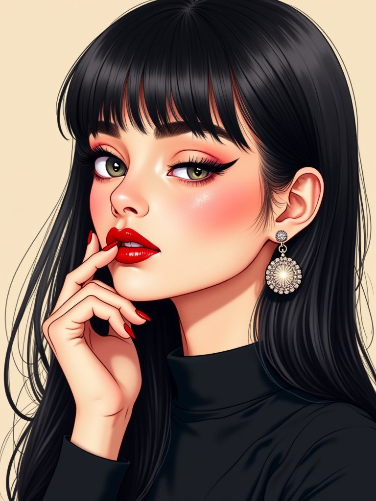 Изящный портретный иллюстрационный стиль запечатлевает молодую женщину в возрасте около двадцати лет, воплощающую современную элегантность и уверенность. Её длинные, прямые волосы цвета воронова крыла сгущаются на лбу аккуратными челками, обрамляющими лицо и добавляющие образу загадочности. Озорной взгляд, выраженный прищуренным глазом и игривым поцелуем на губах, излучает флирт и кокетство. Яркие красные и блестящие губы эффектно контрастируют с её светлой кожей, создавая яркий акцент. Большие глаза, обрамленные длинными, густыми ресницами и идеально прорисованными бровями, притягивают взгляд и подчеркивают глубину образа. Большие круглые серьги с блестящими деталями добавляют образу гламура и утонченности. Темный верх с высоким воротником создает лаконичный фон для лица, а нежная рука, слегка касающаяся щеки, придает композиции мягкость и чувственность. Камера фокусируется на лице и верхней части тела, создавая эффект близости и интимности. Мягкое освещение акцентирует каждую деталь иллюстрации, подчеркивая плавные линии и текстуры. Фон в нежных бежевых тонах служит чистым фоном, позволяя портрету полностью раскрыться. Стиль напоминает детальный набросок или цифровую живопись, передающую мастерство исполнения. Вся композиция излучает женственность, красоту и стиль, создавая атмосферу роскоши и современной изысканности. Это изображение - ода современной женской силе и безупречному вкусу