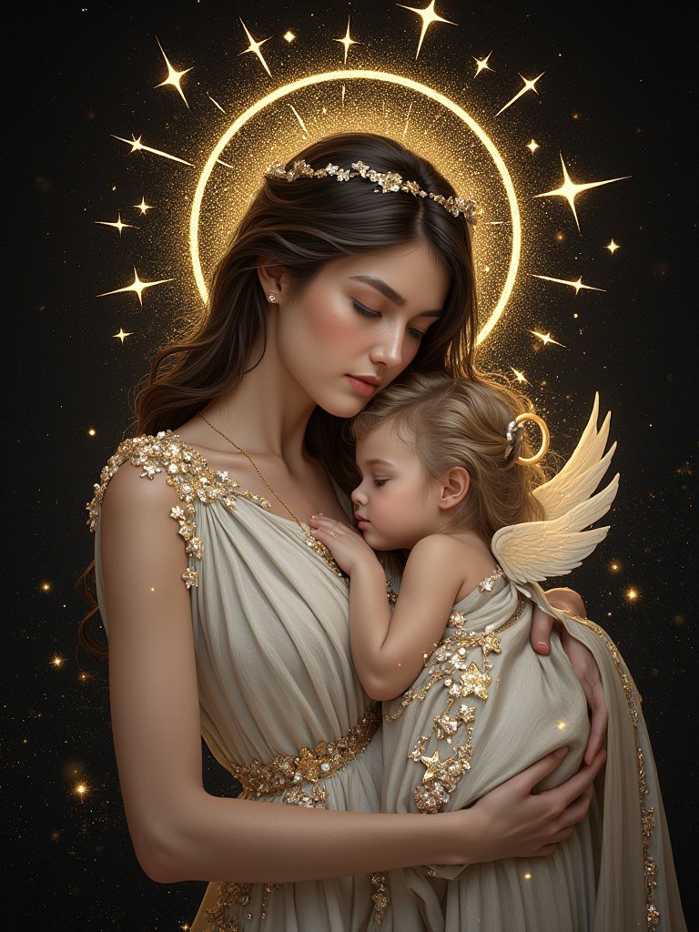 A digital image in which a mother figure gently rocks a small child, both radiating an ethereal light against a stark black background. The woman, apparently of Caucasian descent, has fair skin and a calm, gentle expression on her face. She is about thirty-five years old, with a soft, warm gaze, her eyes slightly closed, radiating an aura of peace and love. She is dressed in a flowing, draped dress decorated with many shining stars, as is the child. The child, about a year old, with angelic features and a matching halo, is nestled close to the woman, looking at her with her eyes closed. Both characters are surrounded by a golden halo that rad...
