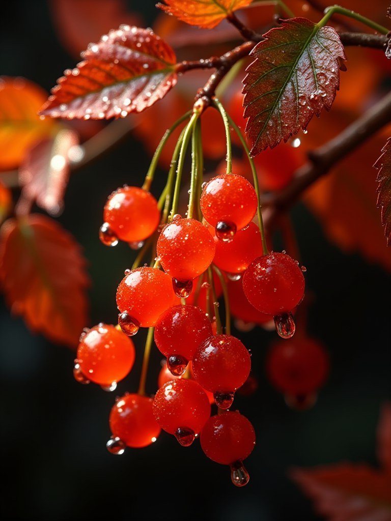Изумительный макроснимок яркого гроздья полупрозрачных красно-оранжевых смородины, сверкающего каплями воды на фоне темного фона. Каждая сочная сферическая ягодка тщательно проработана, демонстрируя внутреннее рассеивание света и мельчайшие отражающие капельки влаги. Смородина висит на тонких зеленых стебельках, ветвящихся и открывающих вид на красно-коричневые листья. Листья, частично покрытые влагой, отличаются богатой текстурой и видимыми прожилками, переливаясь осенними оттенками. Капли воды стекают с плодов и листьев, создавая динамичный эффект. Композиция снята крупным планом, подчеркивая текстуру и сложные детали ягод и листвы. Освещение сосредоточено, создавая тени, которые усиливают трехмерный вид смородины. Изображение вызывает ощущение свежести и природной красоты. Цветовая палитра включает в себя яркие оранжевые, насыщенные красные тона, а также различные оттенки коричневого и зеленого цветов. Атмосфера одновременно спокойная и живая, подчеркивающая красоту природы во всей её красе. Эта фотография - настоящее произведение искусства, демонстрирующее невероятную детализацию и реалистичность, словно ожившая на снимке капля росы, запечатленная в момент наивысшего великолепия. Насладитесь моментом, когда природа раскрывает свою неповторимую красоту, подаренную нам щедрой рукой природы