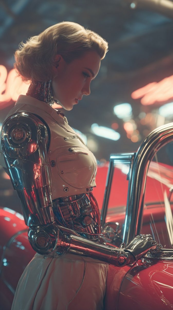 Механическая красавица и ретро автомобиль в стиле киберпанк - Изображение, созданное нейросетью Миджорни