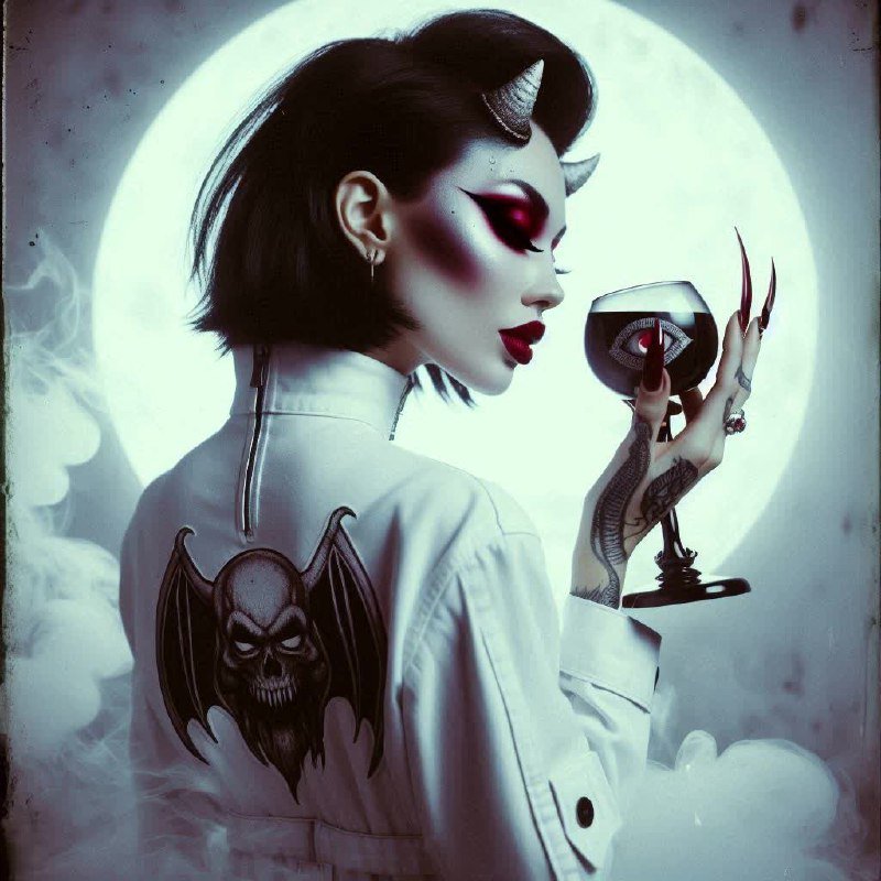 polaroid photograph, aged film grain, swirling mist. woman with crimson lips and obsidian nails delicately holds a shimmering twilight liquid in a goblet adorned with demonic horns; her gaze, a single silver eye framed by raven locks styled in an angular mohawk, carries playful amusement. clad in snow-white jumpsuit emblazoned with a stylized modern gargoyle silhouette, cargo pants, towering platform boots. backdrop: stark white wall reflecting moon’s spectral glow. deep reds and blacks dominate, creating a dance of light and shadow where beauty thrives in darkness.