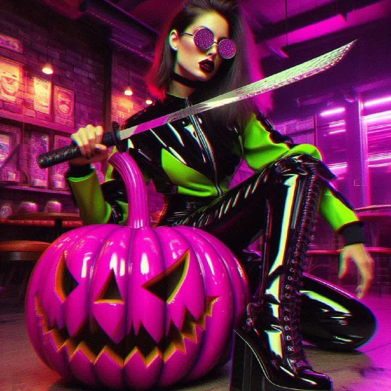 photographic portrait, glitch effect with film grain, unsettling magenta hue. woman engages in playful battle with ornate pumpkin sculpture. adorned in sleek black and neon lime neoprene jacket, tight black vinyl pants, towering platform boots. full crimson lips form confident smirk. silver reflector sunglasses gleam under harsh lights of a futuristic coffee shop; she wields a 'fractal blade,' its surface shimmering with kaleidoscopic patterns reflecting the chaotic cityscape.