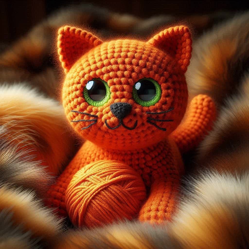 Милый вязаный котик: оранжевый уют с черными полосками и зелеными глазками - Пример изображения, сгенерированного нейросетью Dalle 3