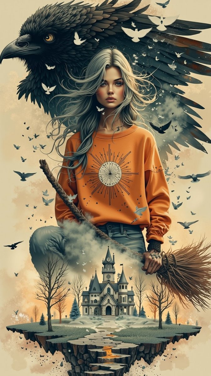 Завораживающее двойное изображение передает ощущение полета и потусторонней красоты. В центре композиции – сияющая девушка, парящая в ночном небе верхом на огромной метле из черного дерева. Метла, словно ожившая скульптура, выполнена из темного эбенового дерева, добавляя сцене мистический оттенок. На девушке надета выцветшая оранжевая толстовка с изображением стилизованного символа ворона, намекая на связь с тайнами и магией. Фоном служит призрачный белый домик из имбирного теста, преобразившийся в жутковатый птичий дворец. Спектральное размытие движения усиливает динамику сцены, создавая впечатление стремительного полета сквозь пространство. Картина пронизана атмосферой загадочности и волшебства, сочетая элементы фэнтези с реалистичным изображением двойной экспозиции. Игра света и тени, а также приглушенная цветовая палитра подчеркивают сюрреалистичность происходящего. Это визуальная поэзия о свободе, силе духа и неразрывной связи человека с потусторонним миром, где границы между реальностью и фантазией стираются в вихре магии. Изображение вызывает ощущение таинственности и заставляет задуматься о скрытых возможностях человеческой души и безграничности воображения