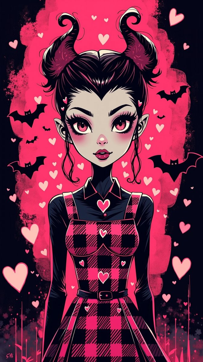 #4 illustration, ink drawing, a pink and black goth style illustration of draculaura, she has heart-shaped eyes with black lashes and white hearts on them, plaid-like patterned dress featuring hearts, bats flying around her, dark background, bright lighting over shoulders, vivid colors, romantic scene #role_monster_high
