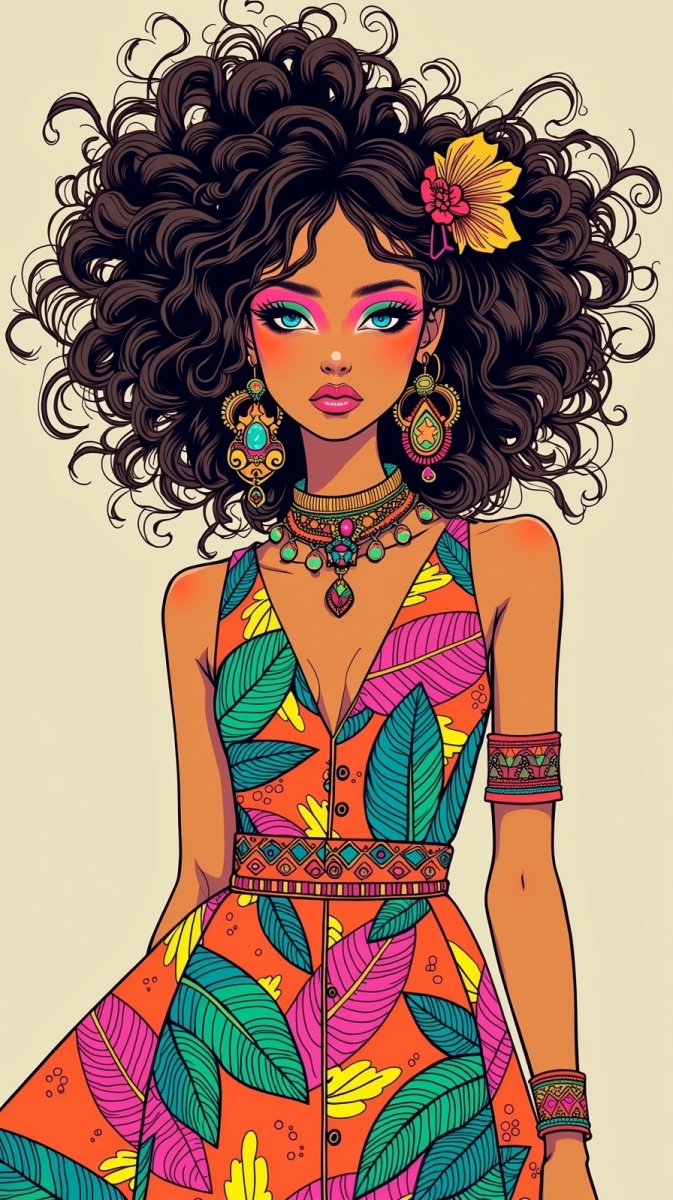 Яркий и эксцентричный портрет индонезийской женщины в стиле авангардной моды восьмидесятых годов. Иллюстрация выполнена в технике туши, создавая эффектный контраст света и тени. Главная героиня обладает невероятно длинными кудрявыми волосами, напоминающими прическу Барби, а ее образ дополняют роскошные серьги в марокканском стиле, искрящиеся блесками. Взгляд привлекает смелый макияж с неоновыми акцентами на глазах и губах – яркие розовые, голубые, зеленые и оранжевые тона создают ощущение психоделического сияния. На женщине представлен необычный наряд, сочетающий в себе элементы высокой моды и богемного стиля: пышное платье с неоновыми элементами и тропический хиппи-костюм гармонично дополняют друг друга. Это не просто иллюстрация – это взрыв цвета и фантазии, воплощенный в ярком образе современной модели, излучающей энергию и уверенность. Каждая деталь, от прически до макияжа, подчеркивает ее индивидуальность и неповторимый стиль, создавая поистине незабываемый визуальный опыт. Использование неоновых оттенков добавляет динамизма и современности, делая этот портрет по-настоящему уникальным произведением искусства. Это воплощение модных трендов и ярких красок, демонстрирующее красоту в ее самых необычных проявлениях