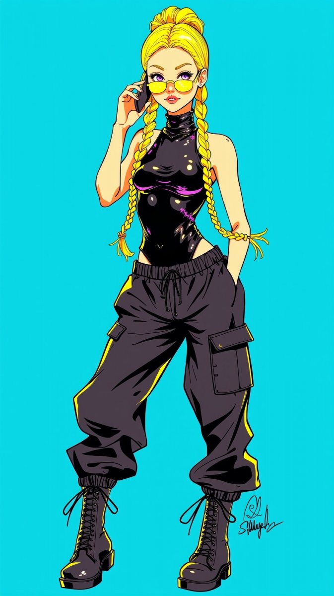 illustration, ink drawing, fashion model, neon colors black one-piece swimsuit with high neckline, shiny material, yellow sunglasses, black combat boots, edgy look, standing against blue background, long bright yellow hair styled in two braids, drawstring waistband pants, reflective pants, sleek updo, holding phone to ear #role_fashion_model