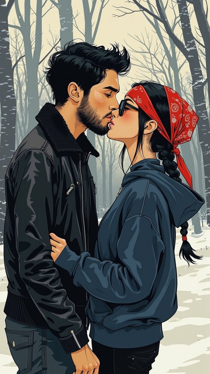 #1. young couple kissing, man with dark hair and beard wearing black leather jacket, emo girl has long dark hair styled in two braids, navy blue sweatshirt, red bandana, black sunglasses, bg is blurred snowy forest, gothic style, rebellious mood, illustration, ink drawing #role_love_is