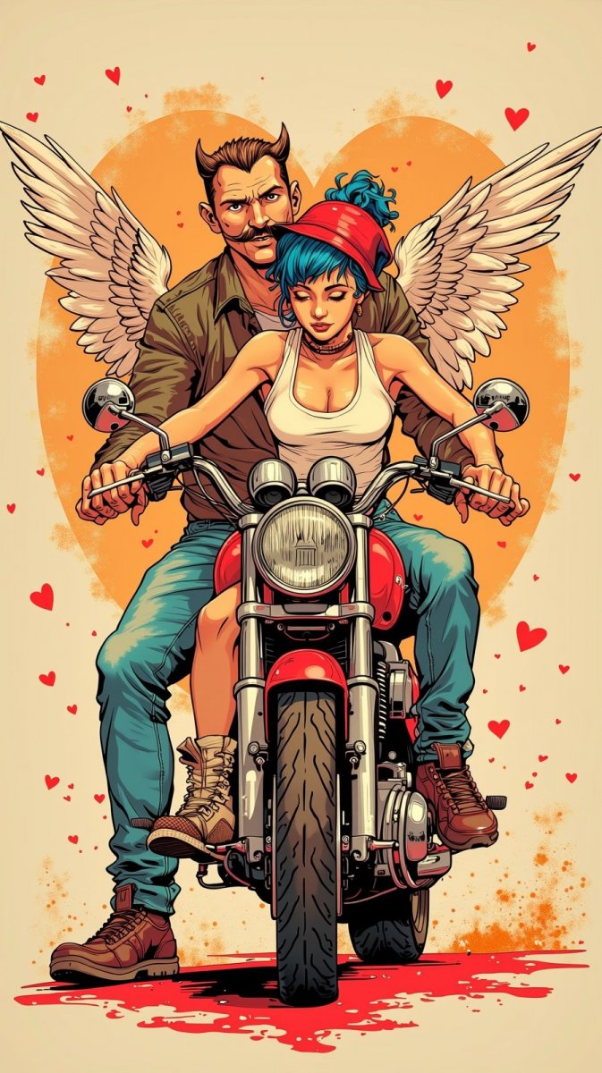 #3. couple sitting on red motorcycle, man demon and angel with mustache, rebel girl wearing denim shorts, red cowboy hat, woman has blue hair in messy bun, arms around man's neck, bg colorful with red heart scattered, overall mood love and affection, illustration, ink drawing #role_love_is