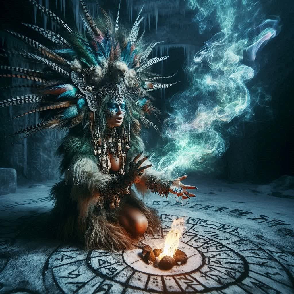 #5 a wise shamaness, her face etched with the wisdom of centuries, conducts a ritual within a forgotten temple buried deep beneath the frozen tundra. She is adorned with bone jewelry and feathered headdress – its iridescent plumage shifting colours in the flickering light of burning runes carved into the stone floor. Her eyes are closed; she chants in a guttural language, her voice resonating with primal power as swirling tendrils of spectral energy rise around her form. In her hands, she holds a staff topped with a pulsating crystal – its surface reflecting visions of past and future events. Atmospheric perspective, volumetric lighting, su...