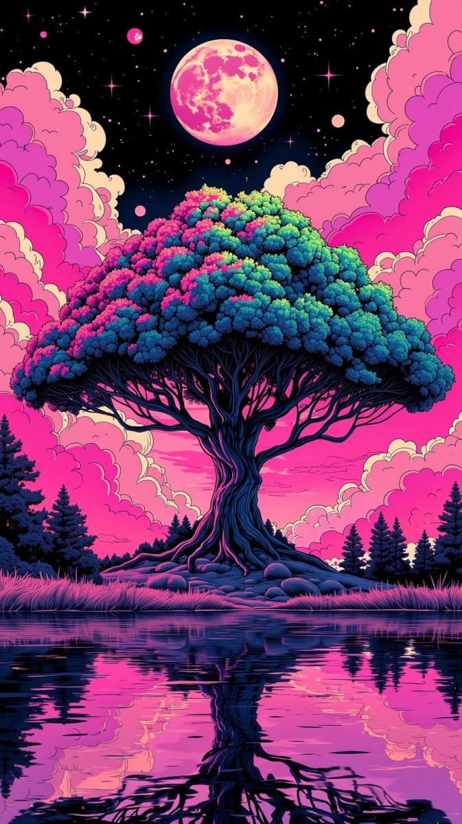 #1 a black-and-white illustration of a giant tree with rainbow leaves, surrounded by pink clouds and purple water, a surreal moon hovering above, reflecting a dreamy aesthetic in glitch art style #role_rainbow