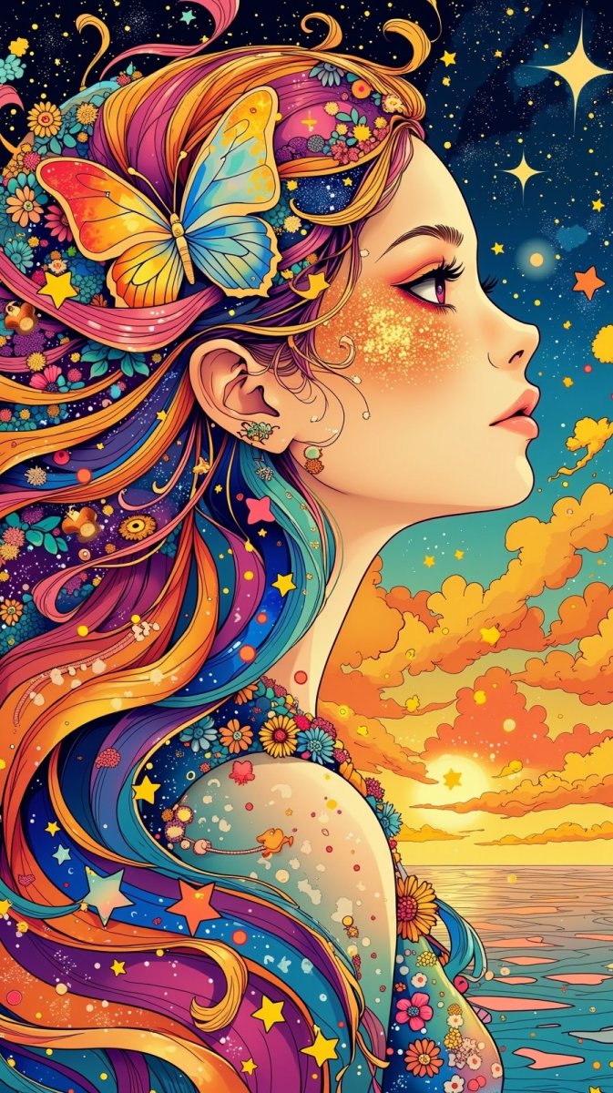 #4. illustration, ink drawing girl with a stunning blend of vibrant aesthetics, her hair flowing in cosmic colors like a radiant sunset. A shimmering butterfly design dances on her cheek, while a backdrop of swirling galaxies adds depth to her enchanting allure. #sp_girl