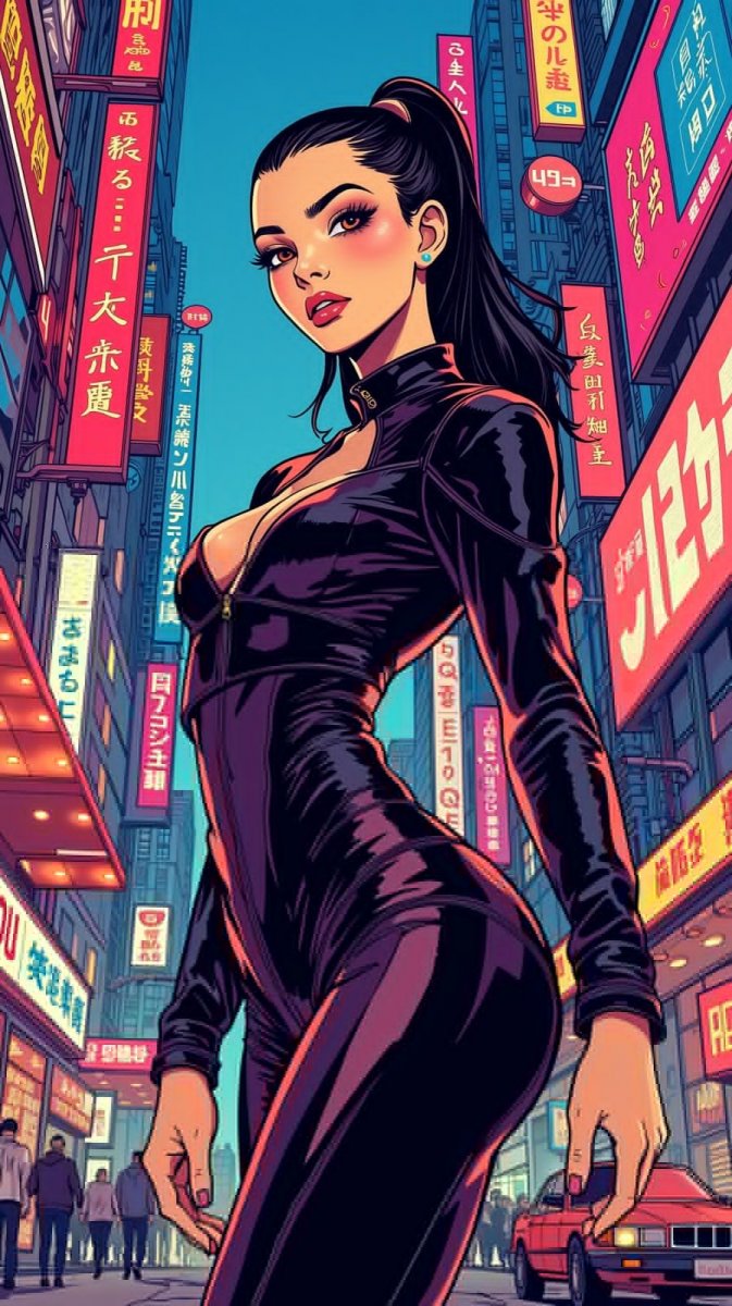 Завораживающая иллюстрация в технике туши изображает эффектную девушку с хищным взглядом и аурой уверенности. Она предстает в образе роковой соблазнительницы, одетой в ультрасовременный киберпанк наряд от именитого кутюрье. Яркий контраст между классической элегантностью и футуристическими деталями подчеркивает ее неповторимый стиль. Вокруг царит динамичная атмосфера оживленного мегаполиса, утопающего в неоновом свете. Каждая линия рисунка передает энергию и страсть, а игра света и тени создает ощущение глубины и реалистичности. Вся композиция пронизана духом дерзости и независимости, делая образ девушки поистине незабываемым. Эта работа – настоящее произведение искусства, сочетающее в себе мастерство исполнения и оригинальную концепцию, идеально подходящее для тех, кто ценит смелые эксперименты в области моды и визуального искусства. Она словно оживает на бумаге, перенося зрителя в мир высоких технологий и ярких эмоций, где красота и сила идут рука об руку. Изображение демонстрирует гармоничное сочетание женственности и футуризма, создавая неповторимый образ современной дивы, способной покорить сердца любого