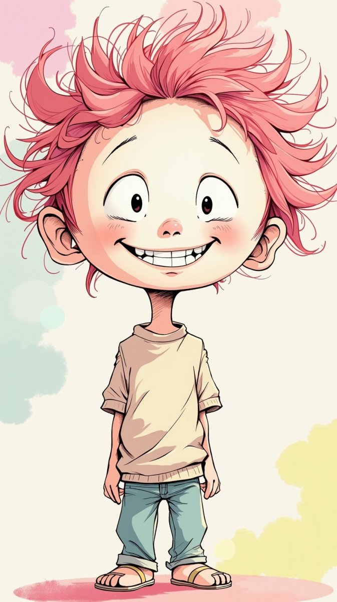 Забавный персонаж с округлым лицом и растрепанными розовыми волосами сияет широкой улыбкой. Его легкий наряд подчеркивает беззаботный характер, а яркий градиентный фон создает атмосферу праздника и веселья. В образе явно прослеживаются элементы карикатуры и наивного рисунка, придающие ему особый шарм и обаяние. Это не просто изображение, это воплощение радости и энергии, созданное с использованием простых форм и выразительных цветов. Персонаж выглядит дружелюбно и приветливо, словно приглашая зрителя присоединиться к его забавам. Акцент на карикатурности и примитивности делает образ легко узнаваемым и запоминающимся, а также добавляет ему игривости и юмора. Он идеально подходит для оформления детских товаров или создания позитивного контента в социальных сетях. Яркие цвета и динамичная поза персонажа привлекают внимание и вызывают положительные эмоции, делая его отличным выбором для различных визуальных проектов, где требуется добавить нотку легкости и веселья. Этот образ — настоящий генератор хорошего настроения, способный очаровать любого зрителя своей простотой и непосредственностью. Его можно использовать в иллюстрациях к книгам, на открытках или в качестве маскота для бренда, стремящегося к созданию позитивного имиджа