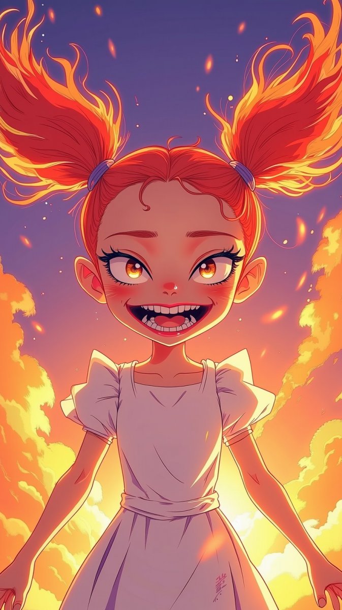 Огненные хвостики и широкая улыбка: гротескный мультяшный персонаж в белом платье - Результат работы нейросети Flux Ai