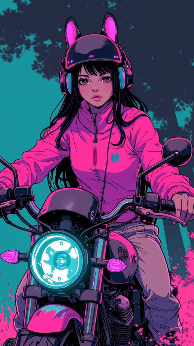 #4. ink drawing, illustration of a young woman on a sleek motorcycle, adorned in a neon ultramarine helmet and a neon pink sweater, featuring long dark hair and futuristic headphones, posing dramatically against a dark atmospheric BG #role_bunny