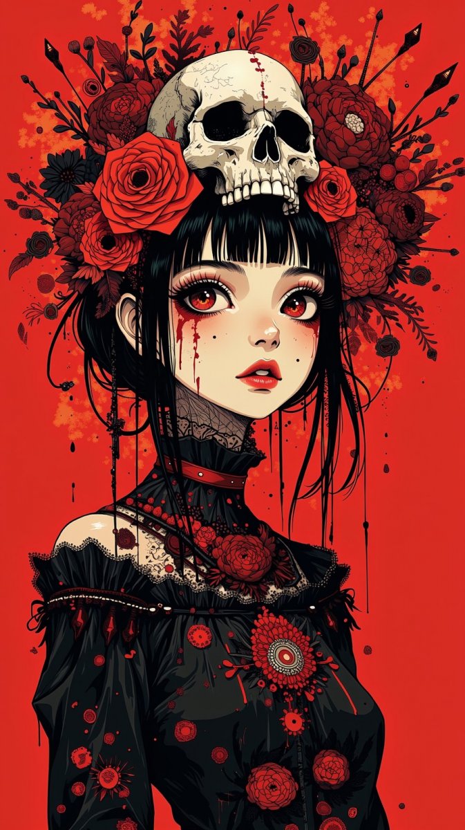 #2. gothic beauty girl with a skull crown, dark and moody aesthetic, dripping red paint, intricate floral designs in the background, high resolution #sp_girl
