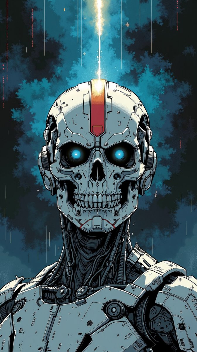 Мрачное и завораживающее изображение роботизированной головы, выполненное в технике чернил и иллюстрации. Конструкция сочетает в себе признаки кибернетического существа и зловещую схожесть с черепом, создавая атмосферу напряжения и предчувствия. Серебристый шлем украшен яркой красной полосой, добавляющей акцент к холодному металлическому облику. Металлический визор скрывает взгляд, придавая изображению ощущение загадочности и безэмоциональности. Сложные узоры, покрывающие корпус головы, свидетельствуют о продуманном дизайне и передовых технологиях. Лучи света, пронзающие темное синее пространство, подчеркивают драматизм сцены и создают ощущение потусторонней силы. Общий тон изображения – интенсивный и зловещий, вызывающий чувство тревоги и предчувствие надвигающейся опасности. Работа представляет собой мастерский пример сочетания органических и механических элементов, исследуя темы искусственного интеллекта, человеческой идентичности и потенциальных последствий технологического прогресса. Изображение воплощает в себе образ киборга, существа, находящегося на стыке человека и машины, символизируя одновременно силу и уязвимость. Это визуальное исследование природы существования в эпоху технологий, предлагающее зрителю задуматься о границах между реальностью и вымыслом, жизнью и смертью