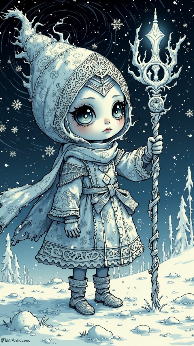 Заснеженный пейзаж хранит в себе печальную красоту: на фоне бушующей метели возвышается хрупкая фигурка куколки-некроманта. Чернильная иллюстрация передает детализированный образ, где каждая линия подчеркивает ее замерзшую судьбу – морозные узоры сковали ее кожу, словно ледяное кружево. В руках она держит костяной посох, символ её темных сил и власти над мертвыми. Вокруг нее пляшут снежинки, создавая атмосферу звенящей тишины и потусторонней загадки. Серебряные руны, выгравированные на ее одежде и посохе, мягко светятся в полумраке, словно живые души, заключенные в хрупкую оболочку. Этот некромант – не просто кукла; это воплощение застывшей магии, печали и одиночества, стоящее на границе между жизнью и смертью. В ее глазах, несмотря на холод, читается отблеск древней мудрости и скрытой силы, намекающей на темные ритуалы и тайны, погребенные под толщей вечного льда. Изображение пронизано ощущением мимолетности и хрупкости, напоминая о неизбежности конца даже для тех, кто держит в своих руках могущественные силы некромантии. Она - воплощение жуткой красоты, застывшей во времени в этом безмолвном царстве вечной зимы