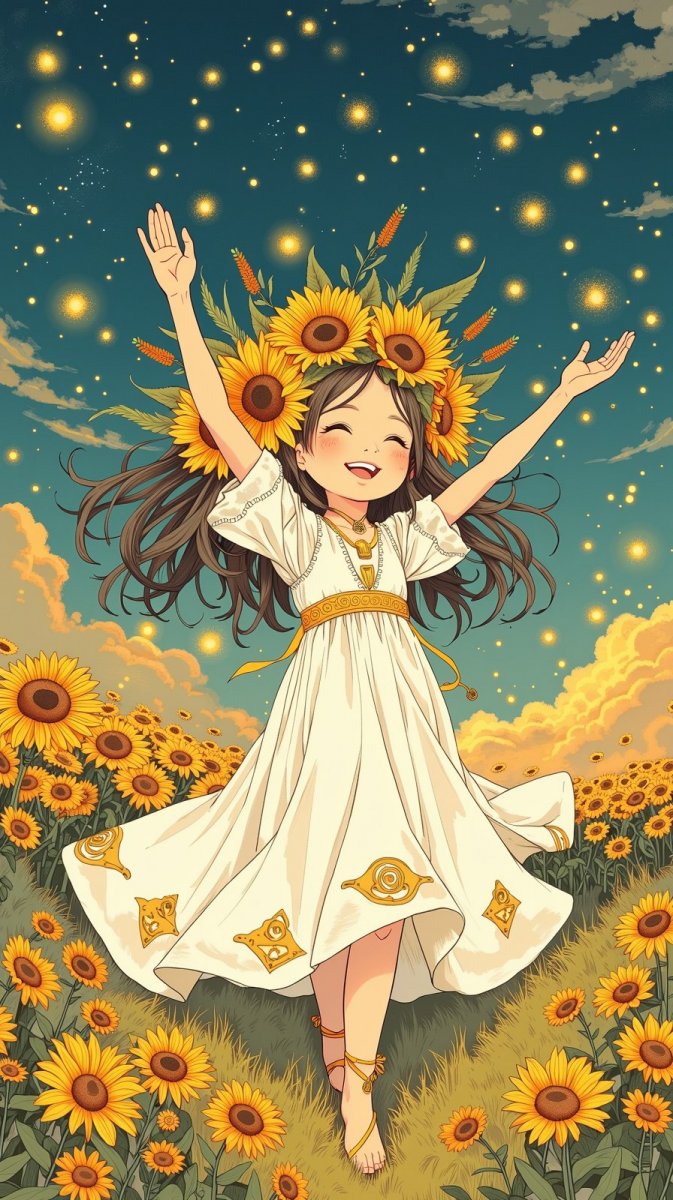 #4. illustration, ink drawing of a joyful ritual doll girl adorned with sunflowers, dancing on a vibrant meadow, wearing a flowing white gown with golden sigils, surrounded by sparkling fireflies at dusk, uplifting energy, #role_magic_doll