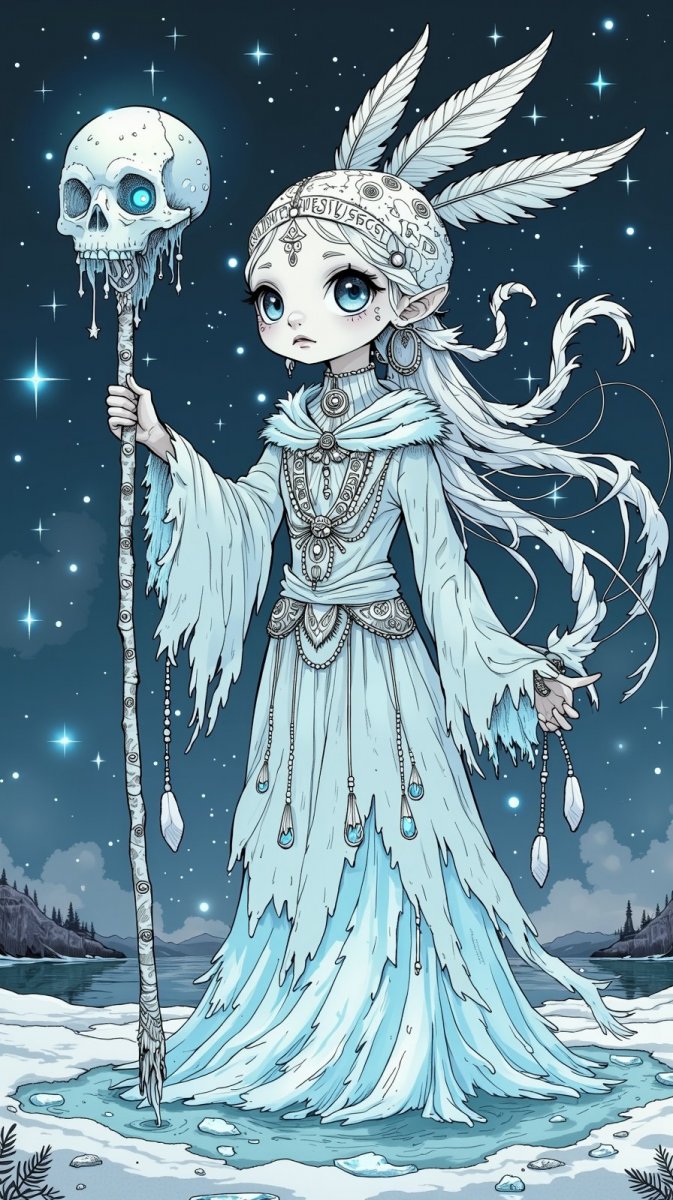 #2. illustration, ink drawing a frostbitten medium doll girl carved from ice, holding a crystal skull staff, standing on a frozen lake with swirling smoke, adorned with feathers and ancient runes, a mystical midnight glow #role_magic_doll