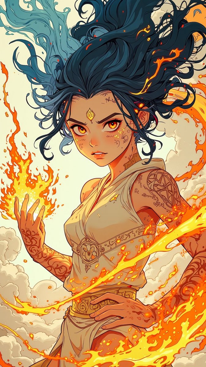 #1. illustration, ink drawing of a fierce elemental mage with blazing runes etched on her skin, summoning a swirling storm of fire and ice around her, eyes sparkling with the clash of elements, wild hair flowing with the tempest, surrounded by dramatic clouds of energy #role_magic