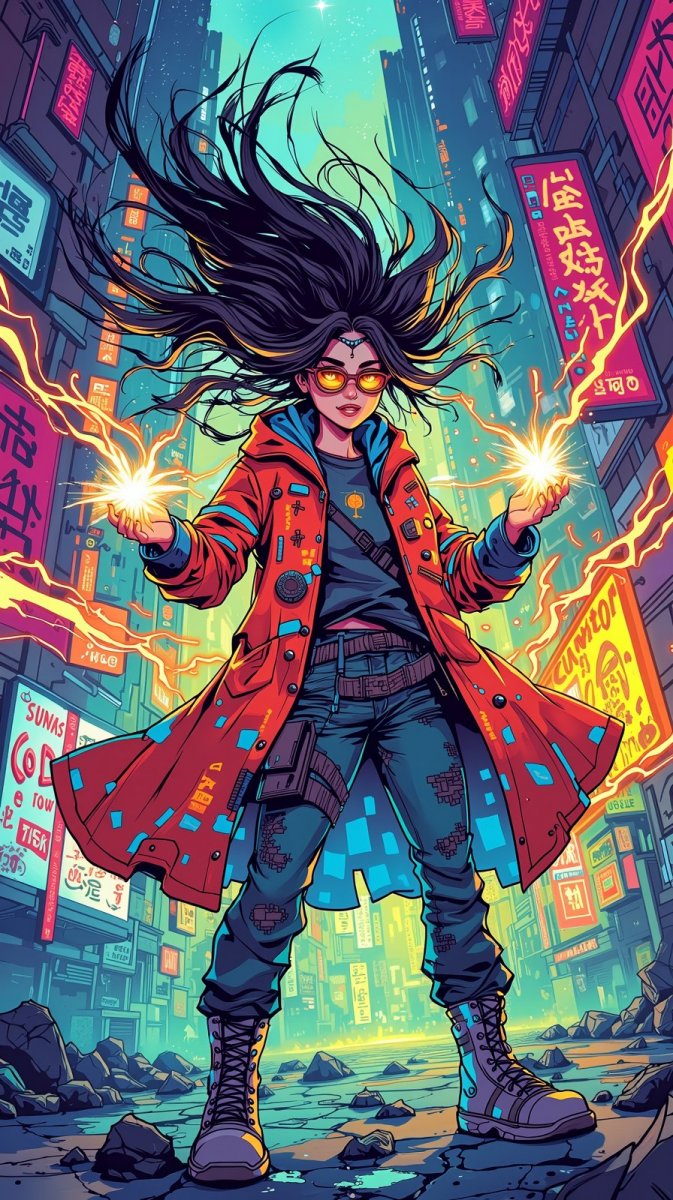 #2. illustration, ink drawing of a mystical urban sorceress dressed in vibrant street style, casting a whirlwind of neon sigils and glowing graffiti, eyes bright with digital energy, wild hair and illuminated edges blending into a technomagical landscape #role_magic
