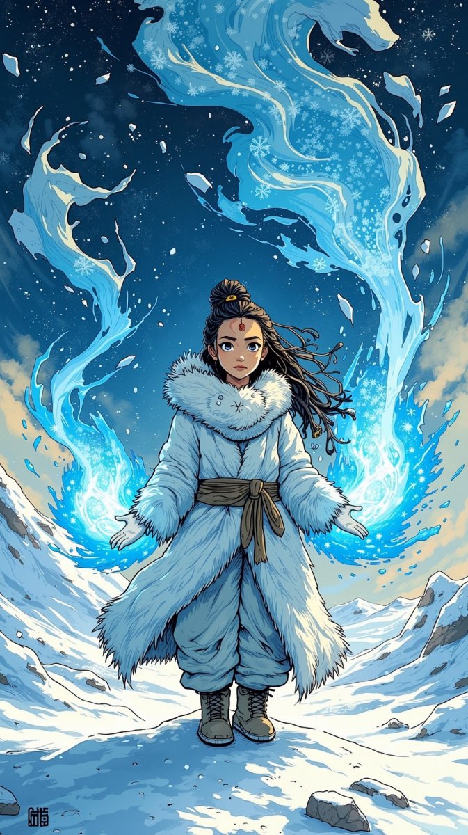 #5. illustration, ink drawing of a fierce Inuit girl standing proud on an icy landscape, clothed in warm furs-drenched in glowing blue magic, summoning swirling snowflakes and intricate ice runes with her hands, reflecting the strength and beauty of her heritage, wild winds dancing around her. #sp_rasa