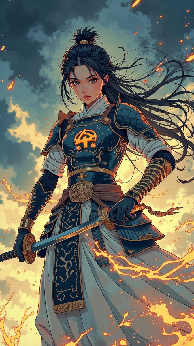 #2. illustration, ink drawing of an elegant samurai girl with striking armor adorned with intricate glowing symbols, standing in a fierce pose under a stormy sky, her long hair billowing in the wind, wielding a shining katana with swirling light effects, battle-ready with a determined gaze, surrounded by ethereal sparks of energy. #sp_rasa