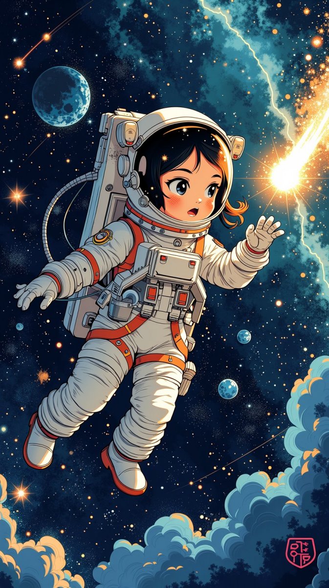 #5. illustration, ink drawing of a determined astronaut girl floating in the vastness of space, surrounded by glowing constellations and swirling galaxies, her space suit glistening with luminescent patches, dynamic lights reflecting in her visor, eyes full of wonder as she reaches out towards a shimmering comet zipping by, cosmic energy pulsating all around her, framed by the magnificent backdrop of the universe #sp_professional