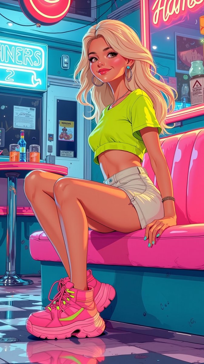#1. a trendy y2k style girl, platinum blonde hair in playful waves, sits on a neon bench at a retro diner. she wears a vibrant neon lime crop-top, a shiny white mini skirt, and bright pink platform sneakers. her colorful nails catch the soft glow of neon signs around her. pastel blue and pink tones flood the background, creating a nostalgic urban atmosphere. relaxed yet fashionable pose, charming smile, and playful expression radiate confidence. #sp_moda