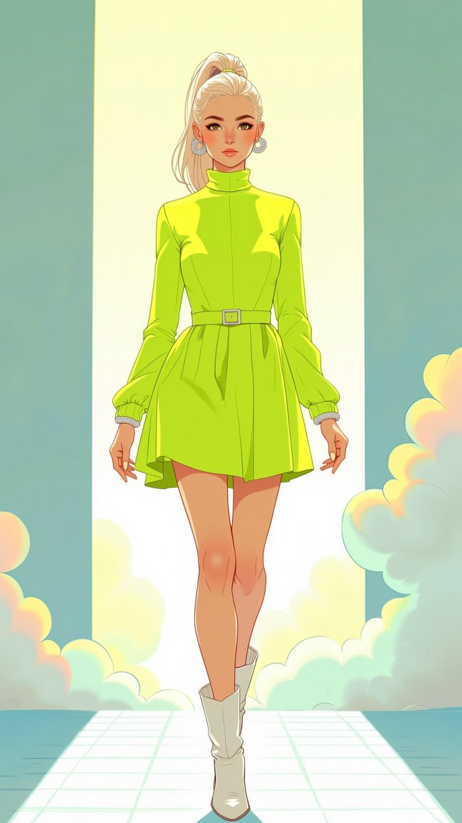 #3. a chic runway fashion girl, platinum blonde in a sleek high ponytail, stands gracefully under a bright pastel spotlight. donning a radiant neon lime dress, she pairs it with elegant white ankle boots. her long, perfectly manicured nails shine bright against the minimalistic set design featuring soft neon hues and artistic silhouettes. poised and confident, she captivates with a serene smile and natural elegance. #sp_moda