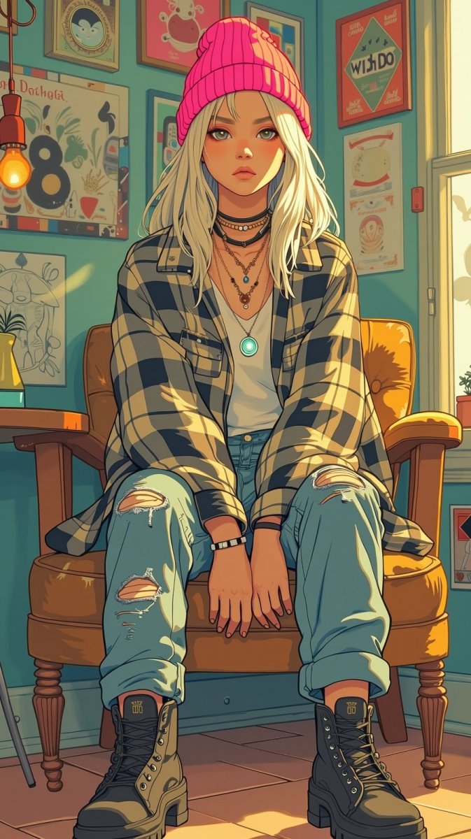 #2 a chic grunge fashion girl, platinum blonde hair with dark roots, sits stylishly on a vintage cafe chair. she sports a distressed oversized flannel shirt, paired with ripped jeans and platform boots. her look is complemented by a bright neon pink beanie and layered necklaces. the cozy, artsy environment features soft lighting and retro decor, capturing a relaxed and effortlessly cool mood. #sp_moda
