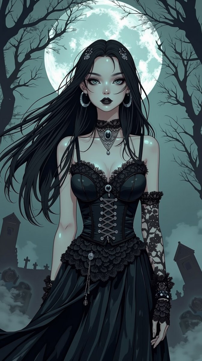 #1 a mysterious gothic girl, flowing black hair cascading down her shoulders, stands confidently in a moonlit graveyard. she wears a lacy dark corset and a long flowing skirt, adorned with silver accessories and black lace gloves. her pale skin glows softly under the moonlight, and her striking dark lipstick contrasts with her delicate features. the background is filled with twisted trees and fog, creating a hauntingly beautiful atmosphere, serene yet eerie, calm and composed, embodying a dark fairy tale #sp_horror