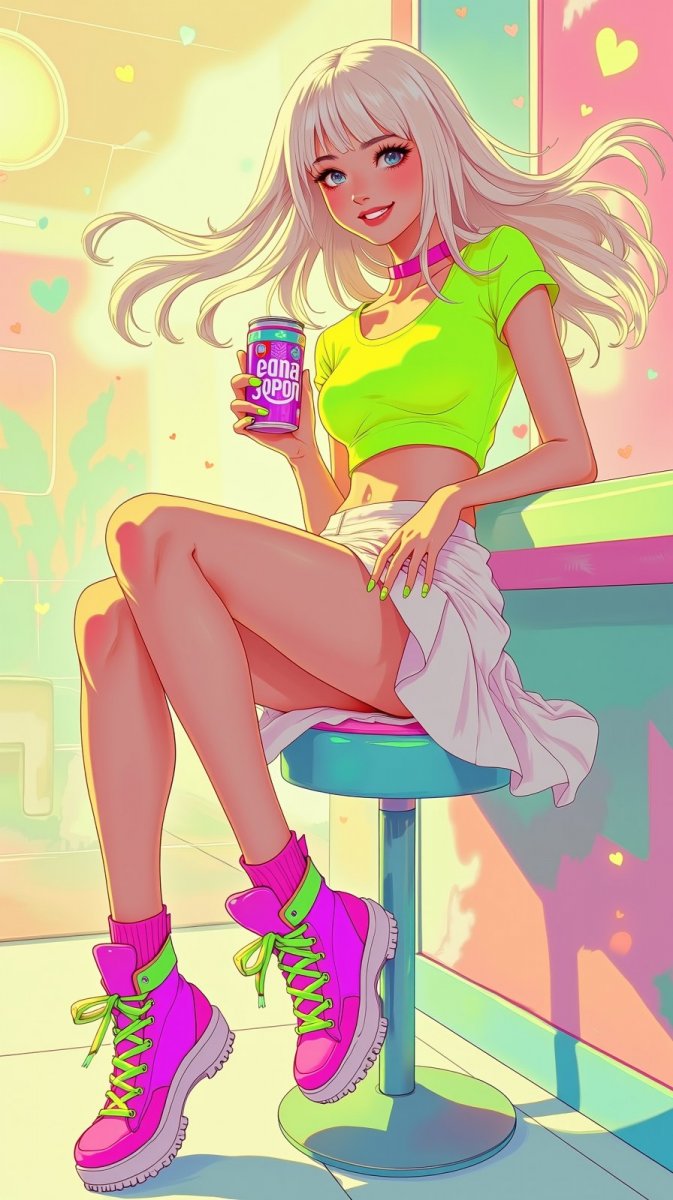 #1. a cheerful girl with flowing platinum blonde hair is sitting on a pastel barstool, wearing a glowing neon lime crop-top and a luminous white skirt. her legs are crossed and she has bright neon pink high-top sneakers with cute accents. she's holding a colorful neon soda can, and her neon lime nails are visible. the background features soft pastel gradients and glowing neon hearts, creating a relaxed and cozy urban atmosphere. #sp_happy