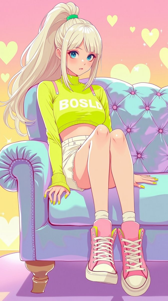 #3. a relaxed girl with platinum blonde hair in a high ponytail lounges gracefully on a pastel velvet sofa, her legs stretched out elegantly. she's wearing a neon lime crop-top, luminous white skirt, and radiant pastel pink high-top sneakers. her fingers are delicately resting on her knees, showcasing neon lime nails, while the soft background of pastel gradients and sparkling neon hearts creates a dreamy atmosphere. #sp_happy
