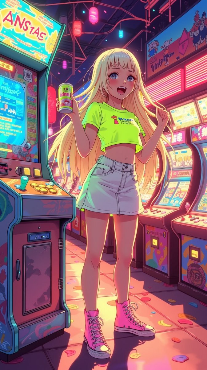 #4. an excited girl with long platinum blonde hair stands confidently beside a glowing arcade cabinet, wearing a glowing neon lime crop-top and a luminous white skirt. her bright neon pink high-top sneakers add a fun element, as she jubilantly holds a pastel soda can, surrounded by vibrant neon lights and retro game machines in the background. #sp_happy