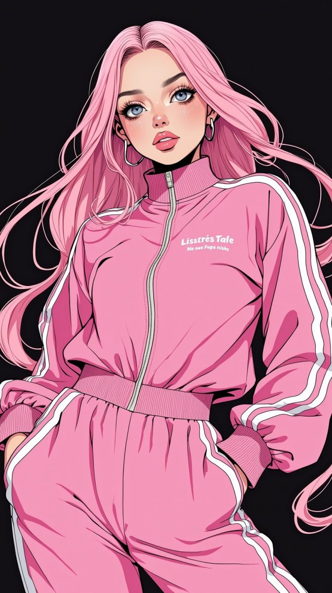 Яркий и дерзкий образ девушки в трендовом розовом спортивном костюме привлекает внимание своей уверенностью и стилем. Изысканная иллюстрация передает атмосферу гламура и игривости благодаря деталям: пышные волосы, струящиеся по плечам, глянцевые губы и сверкающие накладные ресницы. Мрачный минималистичный фон подчеркивает контраст и выделяет главную героиню, создавая эффектный визуальный акцент. Это работа идеально подойдет для модных журналов или рекламных кампаний, ориентированных на молодежную аудиторию, ценящую современность и самовыражение. Иллюстрация воплощает дух смелости и индивидуальности, демонстрируя сочетание спортивного стиля и яркого макияжа. Каждая деталь продумана до мелочей, чтобы создать запоминающийся и динамичный образ, который не оставит равнодушным ни одного поклонника моды и искусства. Этот визуальный шедевр излучает энергию и позитив, привнося нотку дерзости в любой проект. Впечатляющая работа демонстрирует мастерство художника и его умение создавать стильные и актуальные образы. Иллюстрация станет отличным дополнением к вашему проекту, добавив ему оригинальности и привлекательности