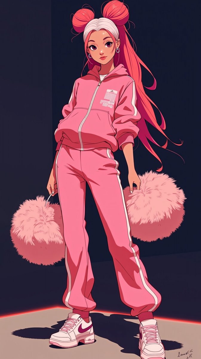 #5. an artistic interpretation of a bubblegum pink tracksuit girl exuding confidence, her long hair in a tight bun, dramatic contour shadow perfectly sculpted, oversized fluffy pom-poms bouncing as she strikes a pose, the dark BG adds an enticing allure to the stylish setting #sp_glam