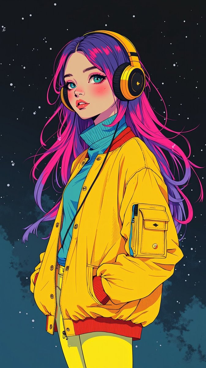 #1. an ink drawing of a young woman with glowing magenta cheeks, dressed in a hot yellow bomber jacket and op-art yellow tights. her long hair features neon gradient ombre streaks, and she wears luminous headphones with an edgy expression against a dark BG, creating a mysterious atmosphere. #sp_acid