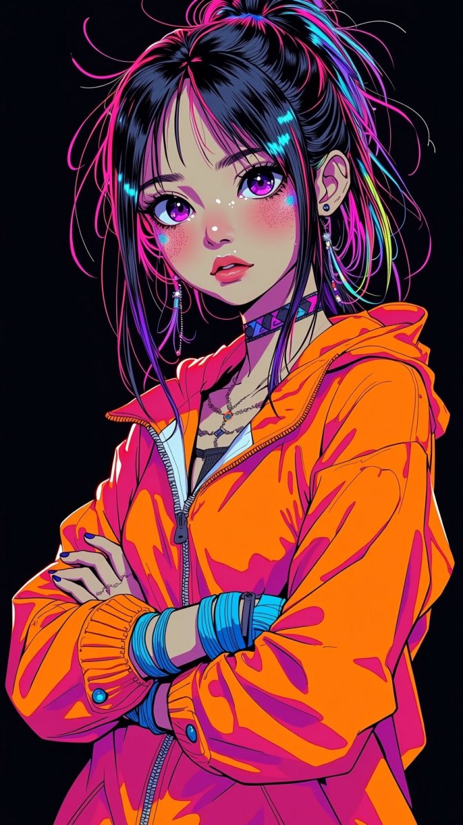 #3. an ink drawing of a young woman with electric violet bangles and neon shimmer face jewels, dressed in a neon orange windbreaker and psychedelic rainbow streaks in her hair. she stands with confidence, arms crossed, against a dark background, enhancing her mysterious and edgy atmosphere. #sp_acid